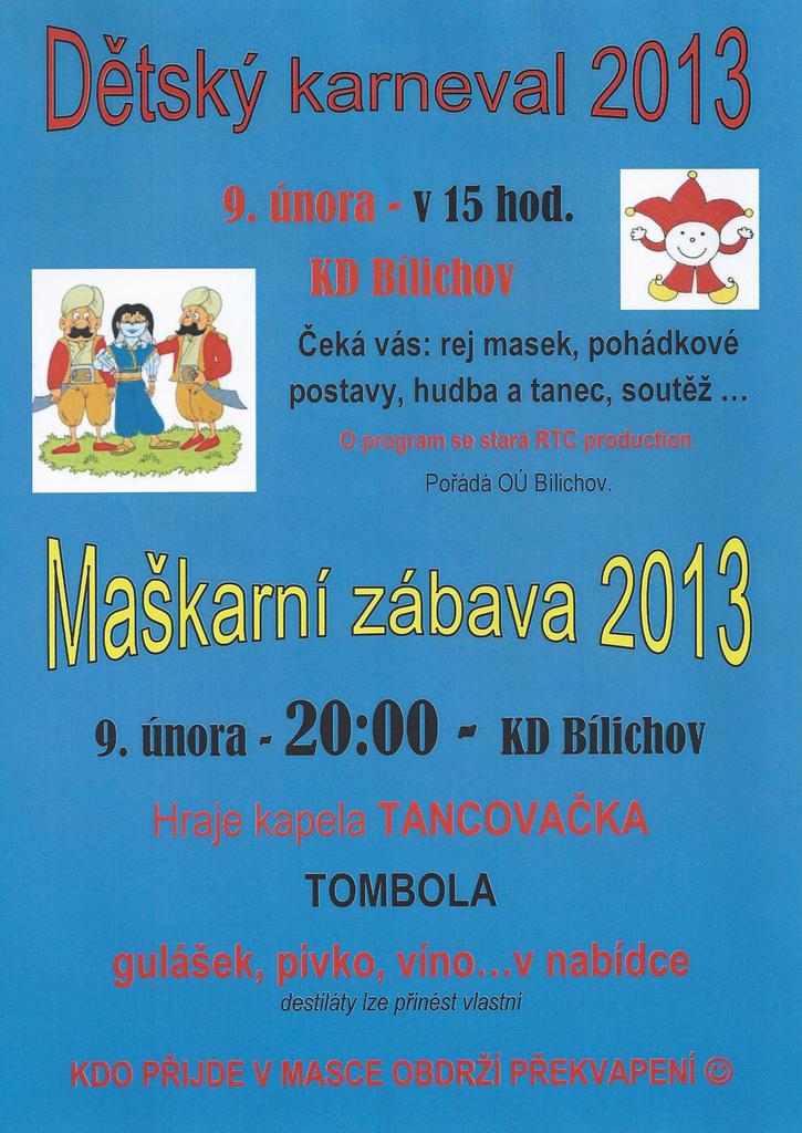 Dovolujeme si vás pozvat na "Dětský karneval 2013" 9.2.2012 od 15:00h v KD Bílichov a na "Maškarní zábavu 2013" od 20:00h. Připravena je tombola, gulášek..... K tanci a poslechu hraje Tancovačka. Pro naše nejmenší je připraven bohatý program, který zajišťuje RTC production.