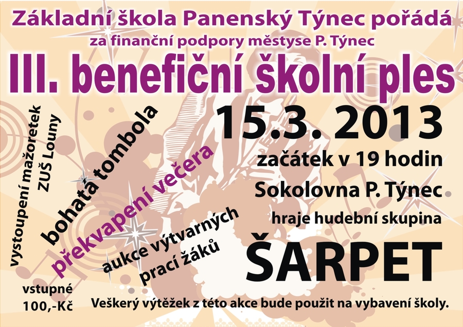 Základní škola Panenský Týnec pořádá za finanční pomoci městyse P. Týnec III.benefiční školní ples 15.3.2013 od 20:00h. Výtěžek z této akce bude použit na vybavení základní školy.