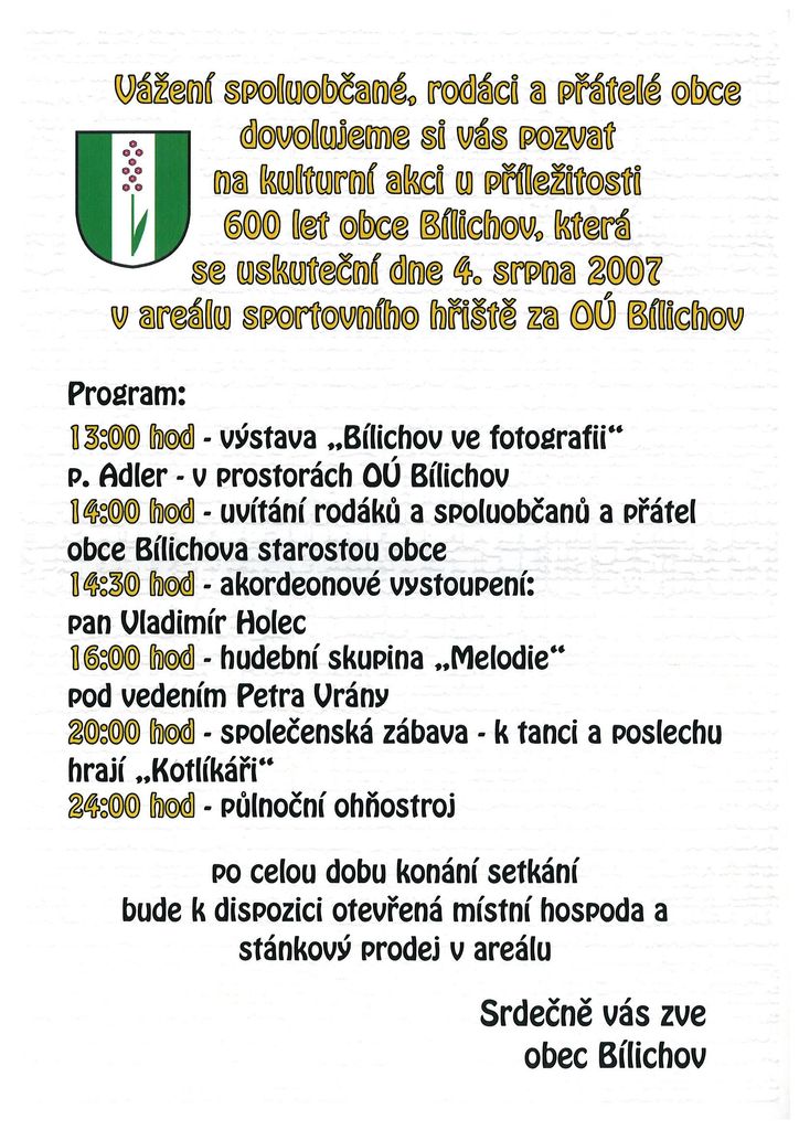 Vážení spoluobčané, rodáci a přátelé obce, dovolujeme si Vás pozvat na kulturní akci u příležitosti 600 let obce BÍLICHOV, která se uskuteční dne 4. srpna 2007 v areálu sportovního hřiště za OÚ Bílichov
