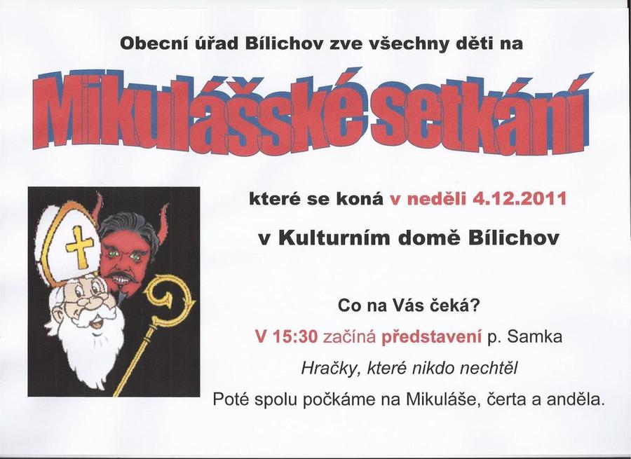 Obecní úřad Bílichov zve všechny děti na "Mikulášské setkání", které se koná v neděli 4.12.2011v Kulturním domě. V 15:30h začíná dětské představení - Hračky, které nikdo nechtěl a po té počkáme na návštěvu Mikuláše, čerta a anděla.