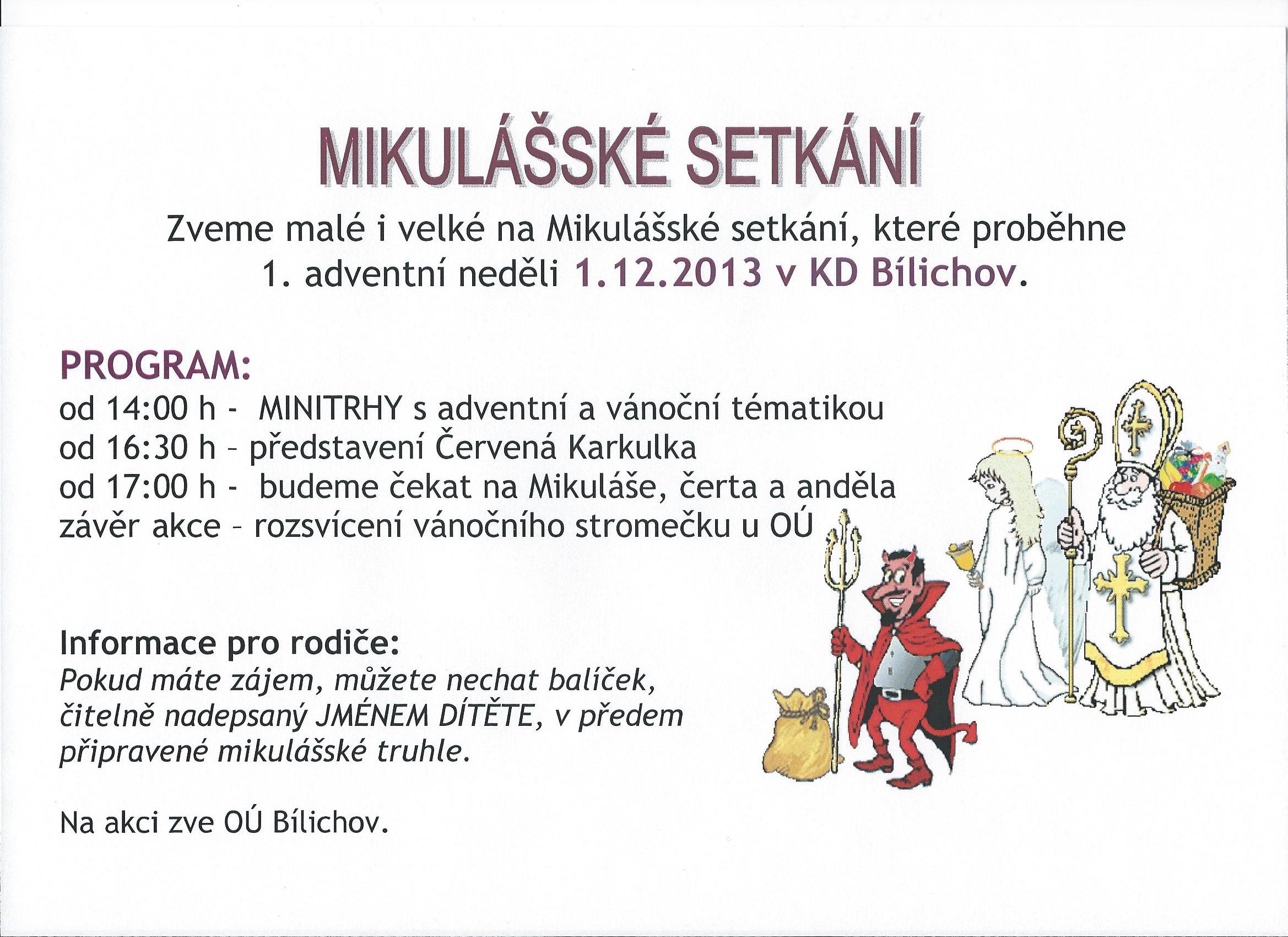 Dovolujeme se všechny pozvat na "Mikuláškou nadílku s představením a rozsvícením vánočního stromku" dne 1.12.2013 od 16:30 v KD Bílichov. Součástí akce bude i prodejní vánoční jarmark od 14:00h.