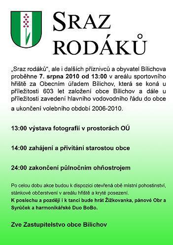 jménem zastupitelstva obce Bílichov si Vás dovoluji pozvat na společenskou akci "Sraz rodáků 2010", která se uskuteční v sobotu 7.8.2010 od 13:00h na sportovním hřišti za OÚ Bílichov.