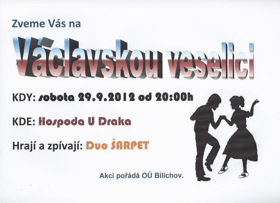 Všechny srdečně zveme na "VÁCLAVSKOU VESELICI", která se koná 29.9.2012 od 20:00h v hospodě "U DRAKA". K tanci a poslechu hraje DUO ŠARPET. OÚ Bílichov