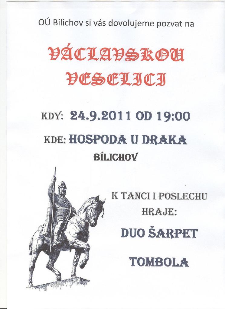 Obecní úřad Bílichov si Vás dovoluje pozvat na "Václavskou veselici", která se uskuteční 24.9.2011 od 19:00h v hospodě "U DRAKA" - Bílichov.