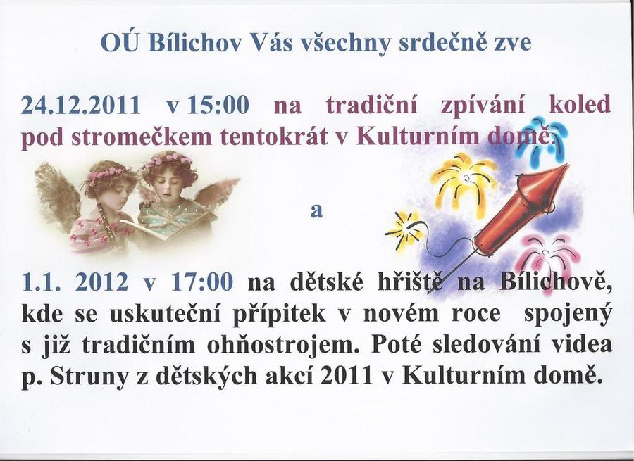 Dovolujeme si Vás pozvat na "VÁNOČNÍ ZPÍVÁNÍ" 24.12.2011 od 15:00h a na !NOVOROČNÍ OHŇOSTROJ" 1.1.2012 od 17:00h.