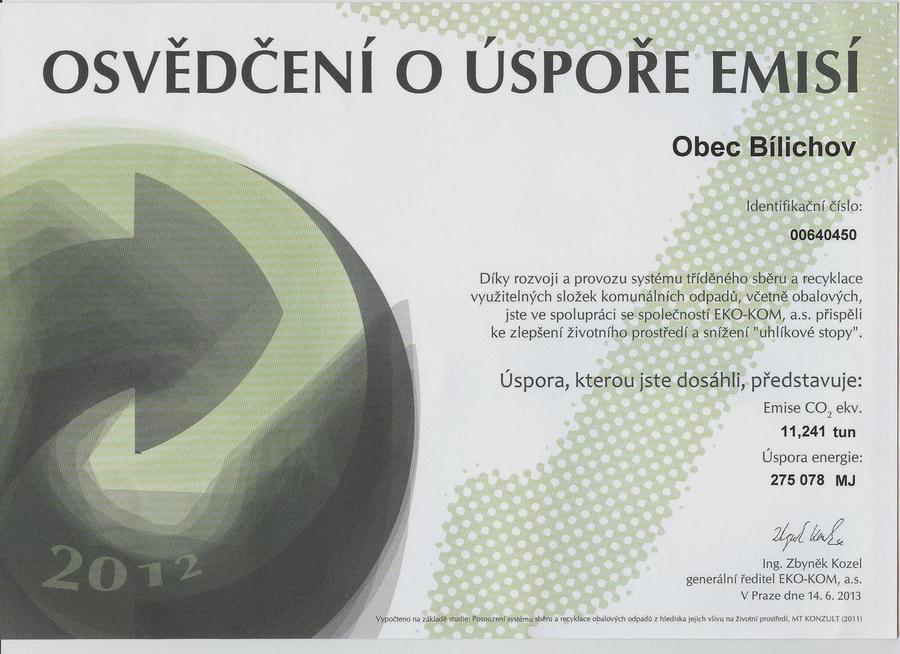 OÚ Bílichov děkuje všem za množství vytříděného odpadu (plast, sklo, papír) za rok 2012 a předkládá "OSVĚDČENÍ O ÚSPOŘE EMISÍ".